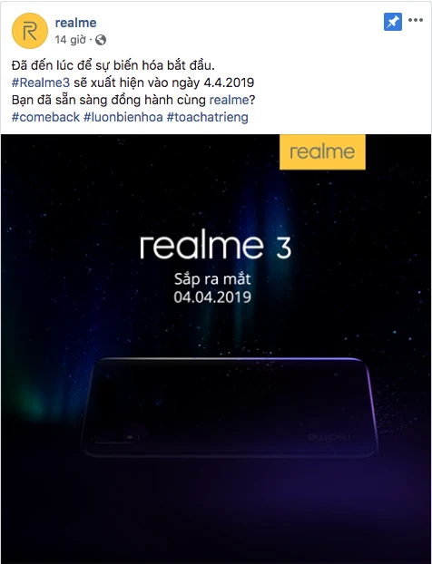 Mới đây, tại thị trường Việt Nam, Realme cũng đã chính thức công bố thời gian ra mắt chiếc điện thoại Realme 3 vào ngày 4-4 trên fanpage chính thức của hãng.