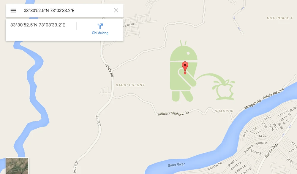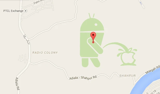 Nếu có dịp bạn đi đến các vùng ngoại ô Rawalpindi, một thành phố lớn ở miền bắc Pakistan, khi ấy có thể bạn sẽ đi qua một logo Android đang “tè” lên logo của Apple.Nếu bạn không thể đi, bạn có thể nhập tọa độ 33°30'52.5"N 73°03'33.2"E lên phần tìm kiếm của Google Maps, hoặc có thể bấm vào đây để xem.