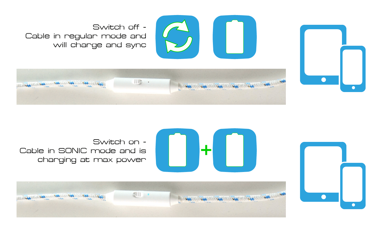 Được đánh giá là sợi cáp USB có công nghệ tiên tiến nhất giúp người dùng sạc nhanh hơn so với những sợi cáp thông thường. SONICable có nhiều cổng sạc cho các loại smartphone và tablet khác nhau, trong đó có có cả cổng sạc Lightning dành cho các sản phẩm của Apple.