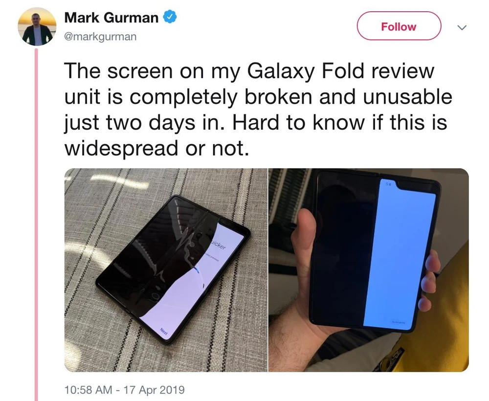 Bohn có lẽ không phải là người duy nhất gặp sự cố khi sử dụng Galaxy Fold. Sau vài ngày sử dụng, chiếc điện thoại của phóng viên Steve Kovach cũng gặp sự cố về màn hình khi một nửa màn hình bên trái liên tục nhấp nháy.