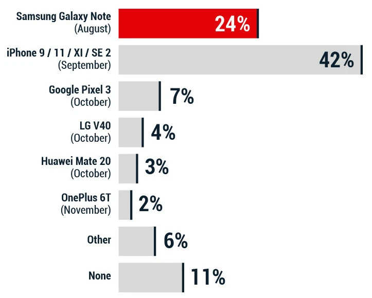 Mới đây, trang PCMag đã tiến hành một cuộc khảo sát trên 1.555 người tiêu dùng tại Mỹ, kết quả cho thấy có đến 42% người dùng mong chờ phiên bản iPhone X thế hệ mới và chỉ 24% quan tâm đến chiếc Note 9 vừa ra mắt.