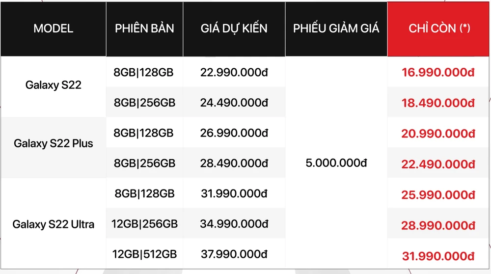 Tương tự như dòng Galaxy S21 series trước đó, năm nay Samsung cũng trình làng 3 model với tên gọi lần lượt là Galaxy S22, Galaxy S22+ và Galaxy S22 Ultra với giá bán chỉ từ 22,9 triệu đồng Và 37,9 triệu đồng cho phiên bản có cấu hình cao nhất.