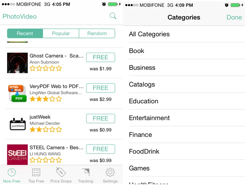 Giao diện của ứng dụng tương đối đơn giản gồm các thẻ chính là Now Free (các ứng dụng có phí hiện đang miễn phí), Top Free (các ứng dụng miễn phí được yêu thích nhất trên App Store) và Price drops (các ứng dụng hiện đang giảm giá). Trong mục Now Free và Price drops, các ứng dụng sẽ được sắp xếp theo 3 tiêu chí là Recent (mới nhất), popular (độ phổ biến) và random (ngẫu nhiên). Bạn có thể nhấn vào nút All categories để phân loại ứng dụng cần tìm theo nhu cầu như education (giáo dục), games (trò chơi), music (âm nhạc), photo & video (hình ảnh và phim),…xong nhấn nút Done. Cuối cùng, bạn chỉ việc nhấn vào nút Free kế bên ứng dụng để truy cập vào App Store và tải về miễn phí. Ngay bên dưới nút Free, bạn có thể biết giá của ứng dụng trước khi miễn phí. Lưu ý rằng, thời gian miễn phí hay giảm giá ứng dụng rất ngắn, do đó bạn nên tải về ngay.