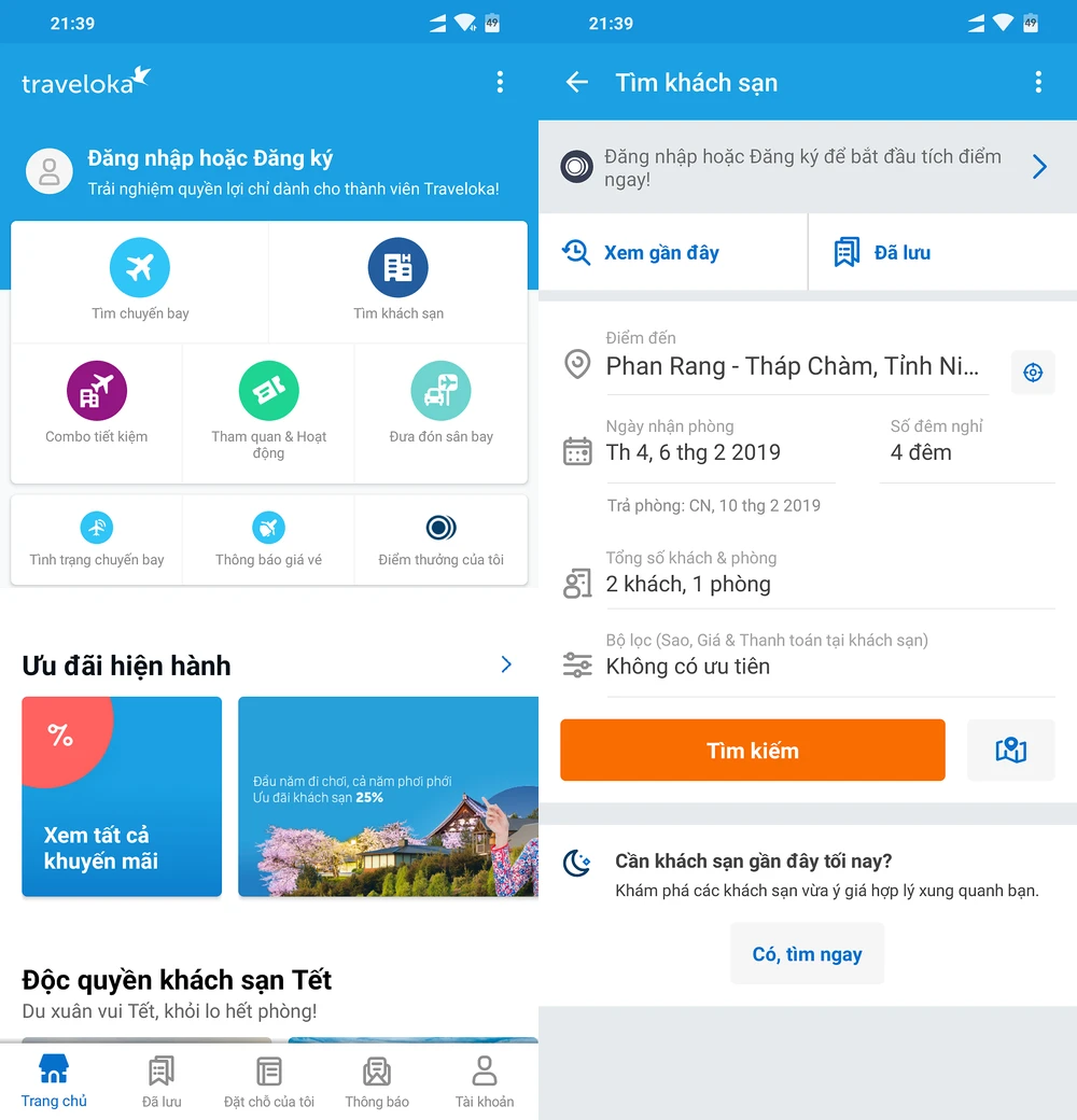 Để tìm khách sạn, người dùng cần lựa chọn điểm đến, ngày nhận phòng/trả phòng, số lượng khách tương ứng rồi nhấn Tìm kiếm. Nếu muốn tiết kiệm thời gian, bạn có thể sử dụng bộ lọc để giới hạn mức giá, hạng sao, tiện nghi,… Từ đó, Traveloka sẽ chỉ gợi ý những khách sạn đáp ứng đúng nhu cầu của bạn.