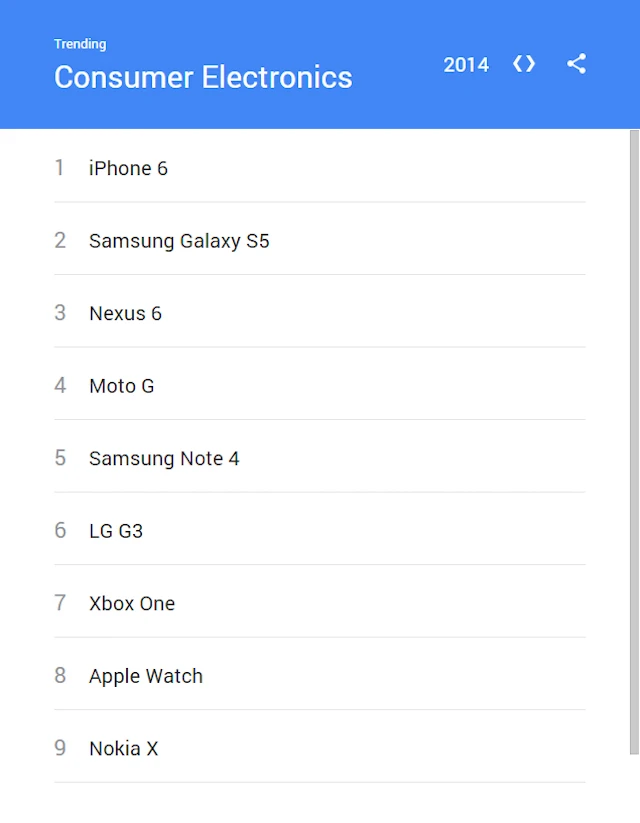 iPhone 5s năm ngoái đã dẫn đầu top danh sách này, một lần nữa iPhone lại tiếp tục đứng đầu bảng xếp hạng trong năm nay với từ khoá sản phẩm iPhone 6. Samsung cũng đứng ở vị trí thứ hai với sản phẩm Galaxy S5 còn Nexus 6 xếp vị trí thứ 3.Tiếp theo là Motorola Moto G, Galaxy Note 4, LG G3. Trong thực tế, các sản phẩm điện thoại thông minh không phải là những thiết bị duy nhất có tên trong danh sách của Google, Microsoft Xbox One và Apple Watch lần lượt chiếm vị trí thứ 7 và 8.