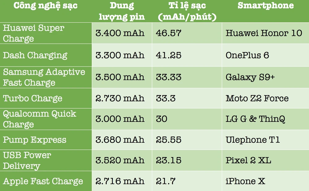 Dưới đây là những smartphone có tốc độ sạc nhanh được đo bằng mAh trên mỗi phút.
