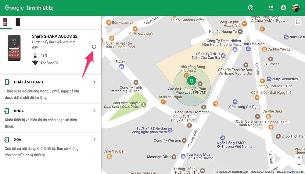 Tiếp theo, bạn hãy lựa chọn thiết bị cần xác định vị trí và chờ một lát để hoàn tất quá trình tìm kiếm. Trên màn hình sẽ có ba lựa chọn khác nhau gồm Ring (phát âm thanh ngay cả khi thiết bị đang ở chế độ im lặng), Lock (khóa thiết bị và đăng xuất tài khoản Google) và cuối cùng là Erase (xóa toàn bộ dữ liệu nếu cảm thấy không có khả năng tìm lại điện thoại). Nếu không xác định được vị trí, nhiều khả năng thiết bị chưa kết nối mạng. Ngay khi có kết nối, vị trí của thiết bị sẽ hiển thị trên bản đồ.