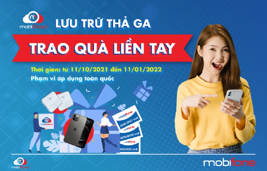 | Chương trình tích điểm diễn ra từ ngày 11-10-2021 đến hết ngày 11-1-2022, áp dụng cho các khách hàng đăng ký sử dụng ứng dụng mobiCloud và mua gói cước mobiCloud (tải ứng dụng, đăng ký tài khoản và mua gói cước sử dụng). Thông tin chi tiết về chương trình “Lưu trữ thả ga – Trao quà liền tay”, khách hàng vui lòng truy cập: https://www.mobifone.vn/dich-vu-di-dong/dich-vu/mobicloud-mobiCloud |