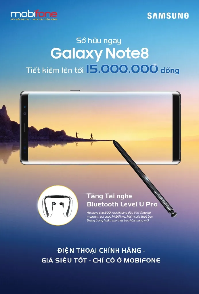 MobiFone tiếp tục áp dụng hình thức bán điện thoại kèm gói cước đối với Galaxy Note 8. Siêu phẩm đình đám này được bán kèm các gói cước có thời hạn M299, M599 và M1399. Khách hàng sẽ chi trả một khoản chi phí cước hằng tháng tương đương với 299.000 đồng/tháng, 599.000 đồng/tháng hoặc 1.399.000 đồng/tháng trong thời gian 12 tháng hoặc 18 tháng để có thể mua điện thoại Note 8 với mức giá tiết kiệm lên tới 15 triệu đồng so với thị trường.
