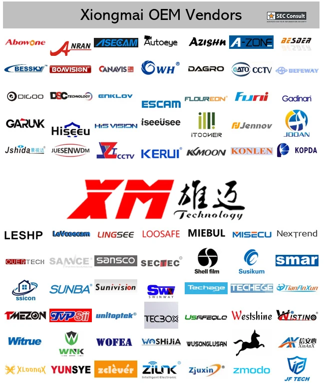Xiongmai là OEM (nhà sản xuất thiết bị gốc, các công ty khác có thể mua lại và dán nhãn công ty của họ), dưới đây là danh sách hơn 100 nhà cung cấp bị ảnh hưởng: 9Trading, Abowone, AHWVSE, ANRAN, ASECAM, Autoeye, AZISHN, A-ZONE, BESDER/BESDERSEC, BESSKY, Bestmo, BFMore, BOAVISION, BULWARK, CANAVIS, CWH, DAGRO, datocctv, DEFEWAY, digoo, DiySecurityCameraWorld, DONPHIA, ENKLOV, ESAMACT, ESCAM, EVTEVISION, Fayele, FLOUREON , Funi, GADINAN, GARUNK, HAMROL, HAMROLTE, Highfly, Hiseeu, HISVISION, HMQC, IHOMEGUARD, ISSEUSEE, iTooner, JENNOV, Jooan, Jshida, JUESENWDM, JUFENG, JZTEK, KERUI, KKMOON, KONLEN, Kopda, Lenyes, LESHP, LEVCOECAM, LINGSEE, LOOSAFE, MIEBUL, MISECU, Nextrend, OEM, OLOEY, OUERTECH, QNTSQ, SACAM, SANNCE, SANSCO, SecTec, Shell film, Sifvision / sifsecurityvision, smar, SMTSEC, SSICON, SUNBA, Sunivision, Susikum, TECBOX, Techage, Techege, TianAnXun, TMEZON, TVPSii, Unique Vision, unitoptek, USAFEQLO, VOLDRELI, Westmile, Westshine, Wistino, Witrue, WNK Security Technology, WOFEA, WOSHIJIA, WUSONLUSAN, XIAO MA, XinAnX, xloongx, YiiSPO, YUCHENG, YUNSYE, zclever, zilnk, ZJUXIN, zmodo, ZRHUNTER.