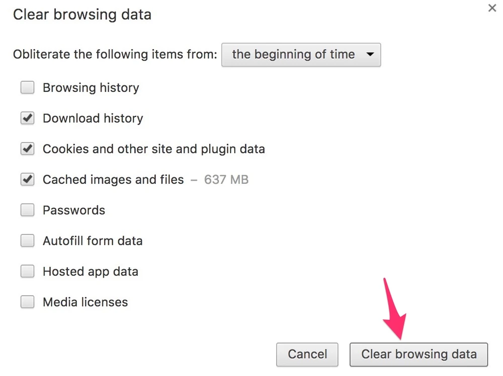 - Bước 3: Tìm đến mục Privacy > Clear browsing data, nếu muốn nhanh hơn, bạn có thể sử dụng tổ hợp phím tắt Ctrl + Shift + Delete (Windows) hoặc command + Shift + Delete (macOS). Tại đây, bạn hãy xóa sạch lịch sử lướt web (Browsing history), lịch sử tải về (Download history), tập tin tạm (Cached images and files) và dữ liệu website (Cookies and other site data)… lựa chọn mốc thời gian cần xóa là the beginning of time rồi nhấn Clear Browsing Data.