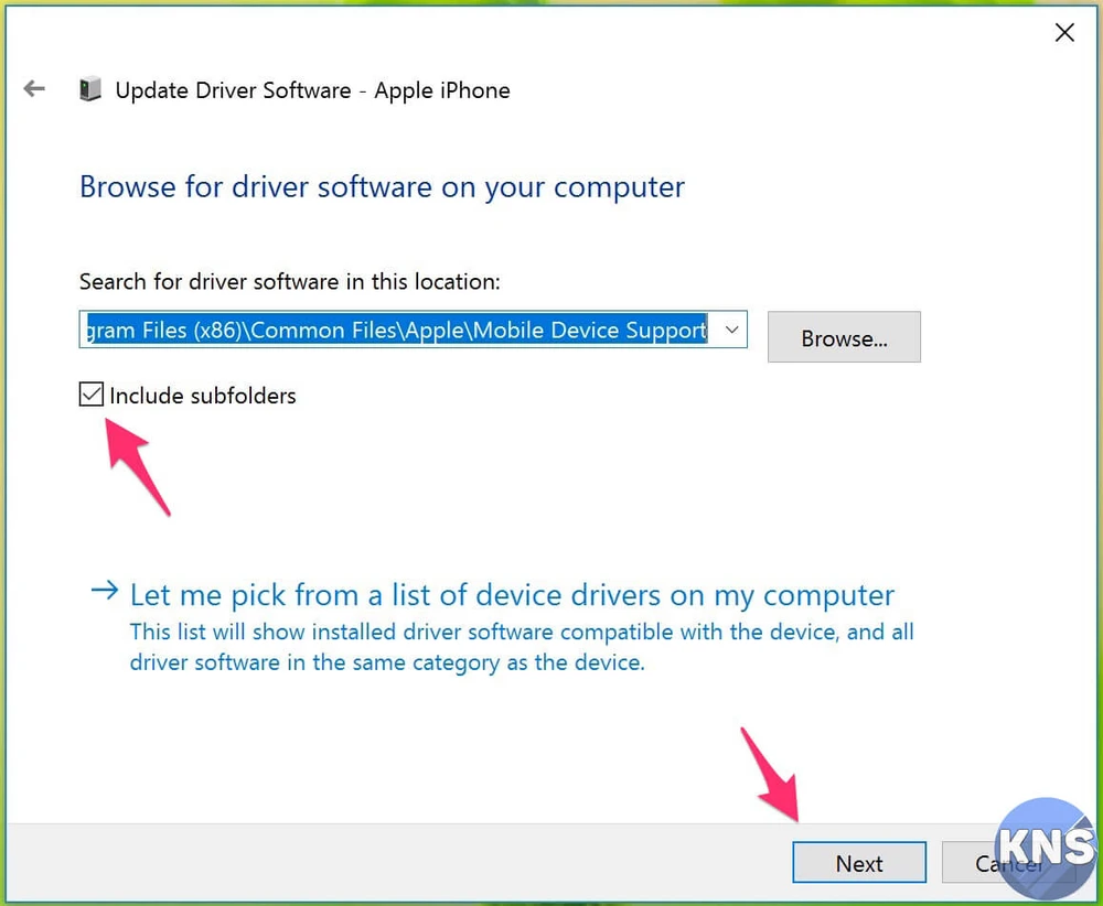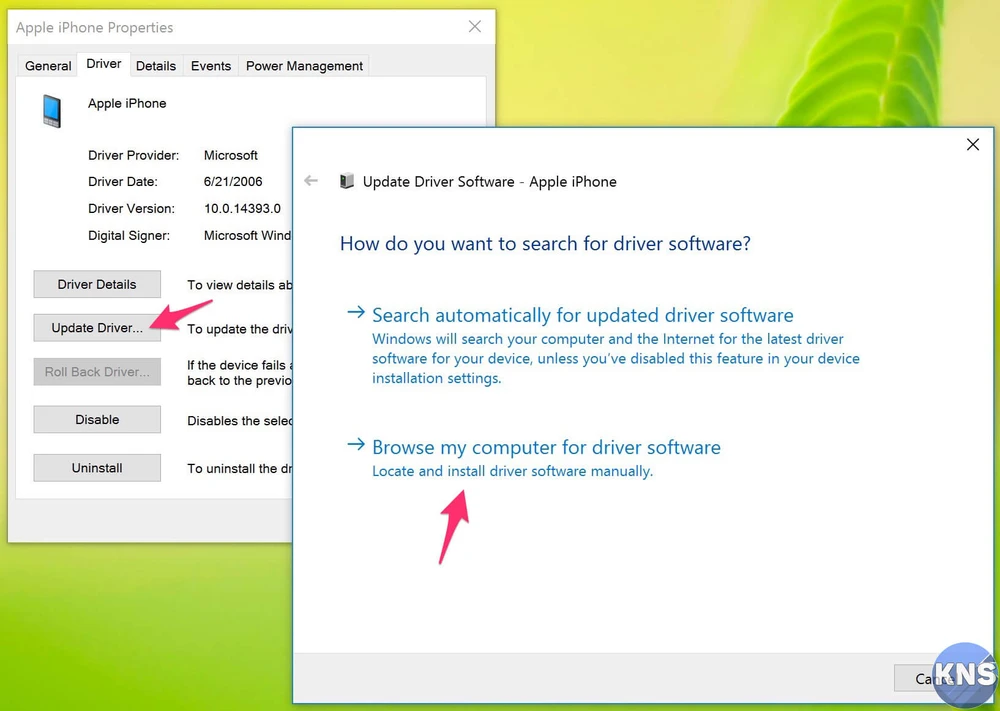 - Bước 5: Trong cửa sổ mới hiện ra, người dùng hãy chuyển sang thẻ Driver > Update Driver > Browse my computer for driver software. Sau đó, tìm đến thư mục theo đường dẫn C:\Program Files\Common Files\Apple\Mobile Device Support\Drivers.