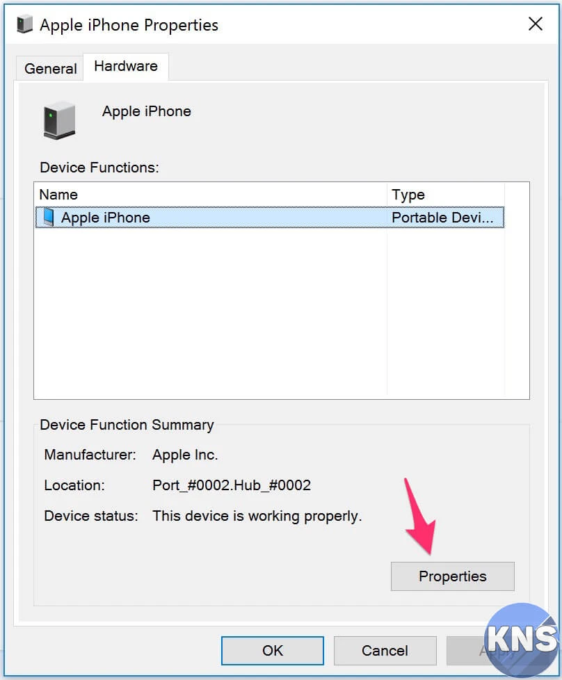 - Bước 4: Tiếp theo, bạn chuyển sang thẻ Hardware, chọn iPhone và kích vào nút Properties > Change settings ở góc phải bên dưới.