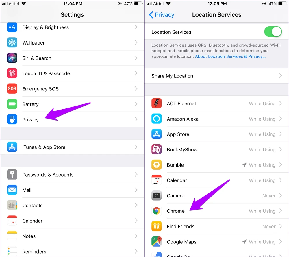 Mặc định, công cụ tìm kiếm mặc định của Chrome sẽ sử dụng dịch vụ định vị để cho kết quả chính xác hơn. Để vô hiệu hóa dịch vụ định vị, bạn hãy vào Settings (cài đặt) > Privacy (quyền riêng tư) > Location services (dịch vụ định vị) > Chrome > Nerver (không bao giờ) hoặc While using the app (trong khi sử dụng ứng dụng).