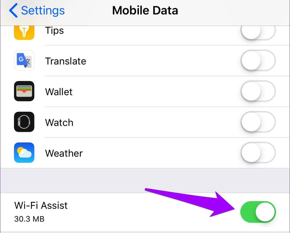 Tính năng này sẽ tự động chuyển từ kết nối WiFi sang dữ liệu di động khi phát hiện tín hiệu mạng bị yếu, điều này sẽ làm giảm đáng kể thời gian sử dụng pin. Để vô hiệu hóa, bạn vào Settings (cài đặt) > Cellular data (dữ liệu di động) > Wi-Fi Assist.