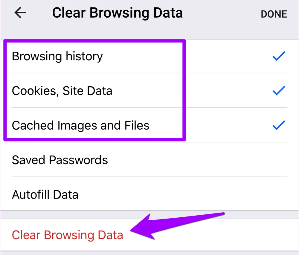 Tiếp theo, bạn hãy đánh dấu vào các tùy chọn Browsing history (lịch sử duyệt web), Cookies, Site data (dữ liệu trang web) và Cached images and files rồi nhấn Clear browsing data (xóa dữ liệu duyệt web).