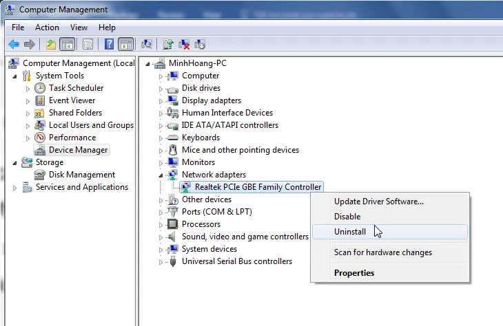 Nếu cách trên không giúp khắc phục vấn đề, bạn hãy thử nhấn phải chuột vào My Computer (hoặc This PC) và chọn Manage > Device Manager. Tiếp theo, người dùng chỉ cần tìm đến mục Network Adapters, chọn driver (trình điều khiển) tương ứng, sau đó nhấn phải chuột chọn Uninstall để gỡ bỏ. Cuối cùng khởi động lại máy tính để thiết bị tự động cài lại driver mới.