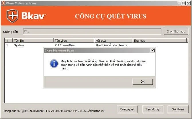 Phía Bkav cũng đã phát hành công cụ miễn phí giúp người dùng phát hiện lỗ hổng EternalBlue tại địa chỉ http://bkav.com.vn/Tool/CheckWanCry.exe, đây là lỗ hổng mà WannaCry đang khai thác để xâm nhập máy tính. Nếu xuất hiện thông báo như hình bên dưới, bạn hãy ngay lập tức báo với nhân viên IT và nhờ họ nâng cấp hệ thống hoặc có hướng xử lý kịp thời.