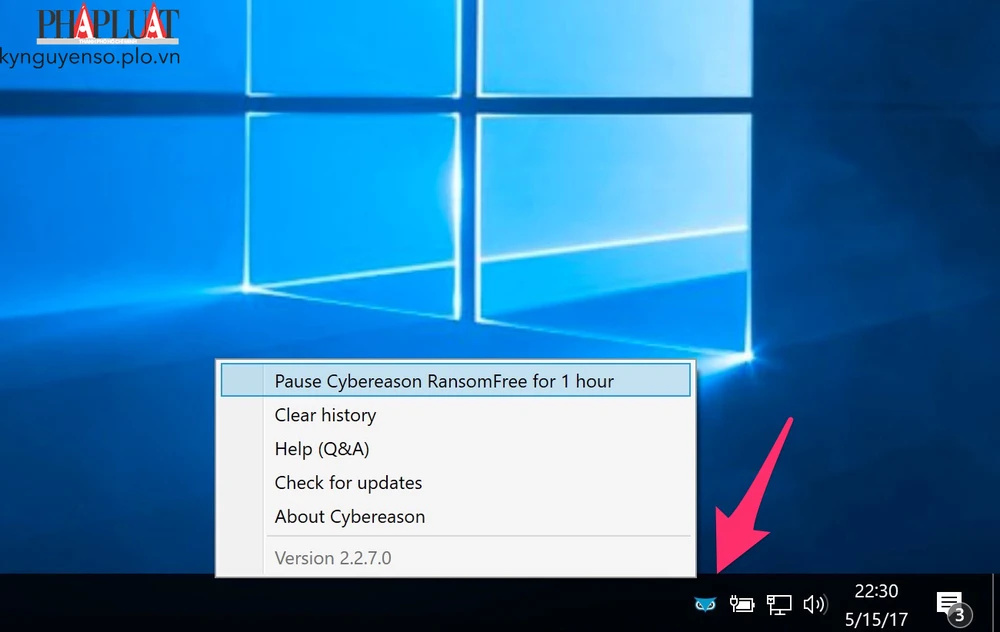 Khi hoàn tất, ứng dụng sẽ bắt đầu chạy nền và hiển thị thông báo khi phát hiện các tiến trình đáng ngờ. Nếu muốn vô hiệu hóa tạm thời RansomFree, bạn có thể nhấn phải chuột vào biểu tượng của ứng dụng ở góc phải và chọn Pause Cybereason RansomFree for 1 hour.
