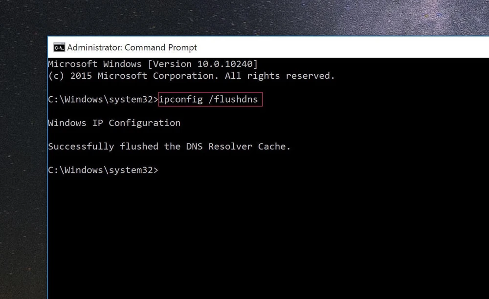 - Bước 2: Tiếp theo, bạn nhập vào dòng lệnh ipconfig /flushdns và nhấn Enter. Nếu thành công, người dùng sẽ thấy xuất hiện thông báo Successfully flushed the DNS Resolver Cache. Lệnh này sẽ giúp làm sạch bộ nhớ đệm DNS, xóa bỏ những file cache lớn (đôi khi là nguyên nhân khiến bạn không thể tải một trang web).