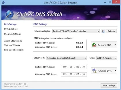 ChrisPC DNS Switch (http://dns-switch.chris-pc.com/) cho phép bạn lựa chọn các DNS có sẵn hoặc tự cấu hình DNS cho Windows. Chỉ với vài cú nhấp chuột đơn giản, tất cả đều được tiến hành một cách tự động. Đầu tiên, bạn khởi động chương trình và lựa chọn DNS cần xài tại dòng DNS Presets, sau đó nhấn Change DNS.