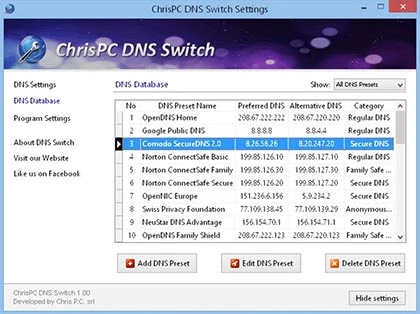 Mặc định, hiện tại ChrisPC DNS Switch đã cung cấp sẵn cho người dùng 34 máy chủ DNS thông dụng nhất hiện nay, bên cạnh đó bạn cũng có thể tự thêm vào các cấu hình DNS của riêng mình bằng cách nhấn vào DNS Database > Add DNS Preset và điền thông tin vào. Lưu ý: Bạn nên khởi động lại trình duyệt để đảm bảo rằng DNS mới hoạt động hiệu quả.