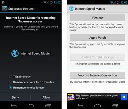 Tuy nhiên, đối với những người sử dụng các thiết bị Android chưa root, thì tính năng Apply patch sẽ bị vô hiệu hóa. Thay vào đó, bạn cần phải nhấn vào tùy chọn Improve Internet Connection > OK. Nếu bạn muốn khôi phục lại trạng thái trước đó thì kích vào nút Restore > OK, sau đó lựa chọn các bản sao lưu cần sử dụng tùy theo từng mốc thời gian là được.