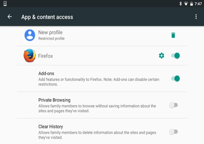 Bên cạnh đó, trong lần cập nhật này Mozilla cũng bổ sung tính năng Restricted Profile cho Firefox (Users > Add User or Profile > Restricted Profile). Với tính năng này người dùng có thể ngăn không cho Firefox truy cập vào camera và micro của mobile nhằm hạn chế việc trẻ nhỏ sử dụng các ứng dụng web để chat video.