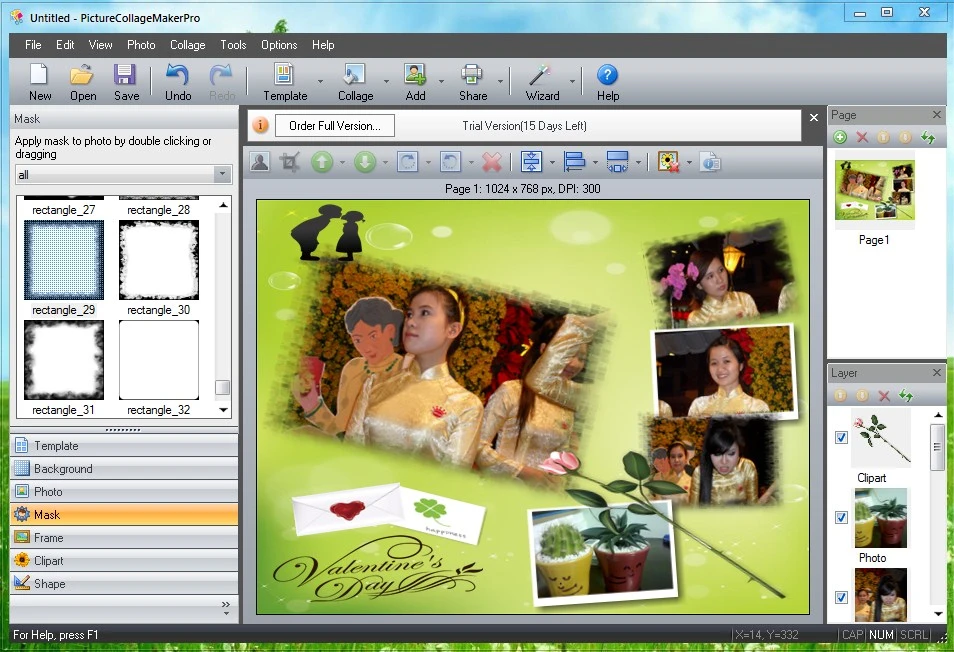 Tương tự như các chương trình khác, Picture Collage Maker cũng hỗ trợ Mask (mặt nạ) cho hình ảnh. Đầu tiên, bạn nhấn vào một hình ảnh bất kì, sau đó chọn các mẫu trong thẻ Mask, và ngay lập tức nó sẽ áp dụng vào hình ảnh mà bạn đã chọn. Thẻ Frame là nơi cung cấp các khung hình đẹp mắt với 2 tùy chọn cơ bản là Picture Frame (bao gồm các khung hình ảnh với các kích cỡ và kiểu dáng khác nhau) và Color Frame (các khung hình được bao quanh bởi các màu sắc đơn giản).