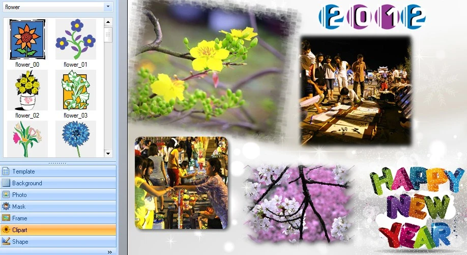 Chương trình đi kèm với một thư viện hình ảnh đồ sộ, cung cấp nhiều bố cục và ảnh nền cho công việc cắt dán. Nếu muốn đổi sang một mẫu khác, bạn chỉ việc chọn lại trong thẻ Template, sau đó việc thêm hình vào bằng cách kéo thả chúng vào khung, hoặc nhấp đôi vào khung rồi chọn đến các tấm hình cần sử dụng.