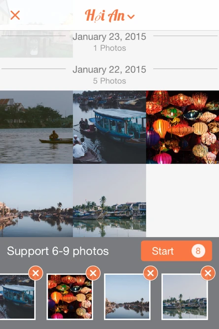 Đầu tiên, bạn hãy chạm vào biểu tượng dấu cộng để mở thư viện ảnh. Sau đó lựa chọn các bức ảnh cần sử dụng từ Instagram, Facebook (yêu cầu đăng nhập tài khoản) hoặc các album ảnh khác có sẵn trên thiết bị iOS rồi nhấn Start để bắt đầu.