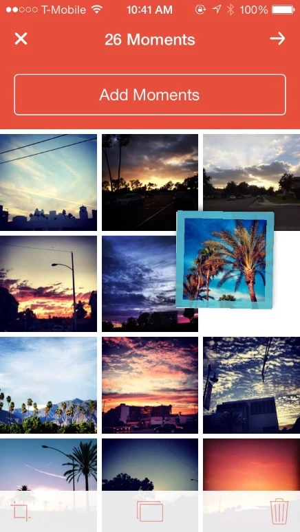 Sau khi đã thêm đầy đủ tất cả hình ảnh cần sử dụng, bạn hãy sắp xếp nó lại bằng cách thay đổi vị trí sao cho phù hợp. Thanh menu nhỏ bên dưới bao gồm 3 biểu tượng để bạn cắt cúp (thu nhỏ hoặc phóng to đến 1 vị trí bất kỳ trên ảnh), nhân đôi và xóa hình. Chạm vào nút Next ở góc phải để để bắt đầu việc thiết lập các thông số nâng cao.