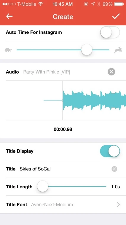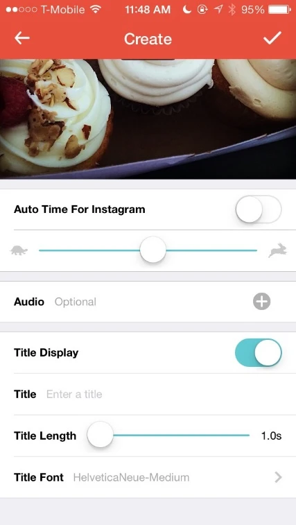 Tùy chọn Auto Time For Instagram cho phép bạn lựa chọn giữa 2 chế độ, một là thời gian phát của video sẽ được ứng dụng thiết lập tự động hoặc do người dùng cấu hình thủ công. Bên cạnh đó, Flipagram còn cung cấp các lựa chọn để chèn âm thanh (Audio) và tiêu đề (Title Display) cho video thông qua các mục tương ứng.