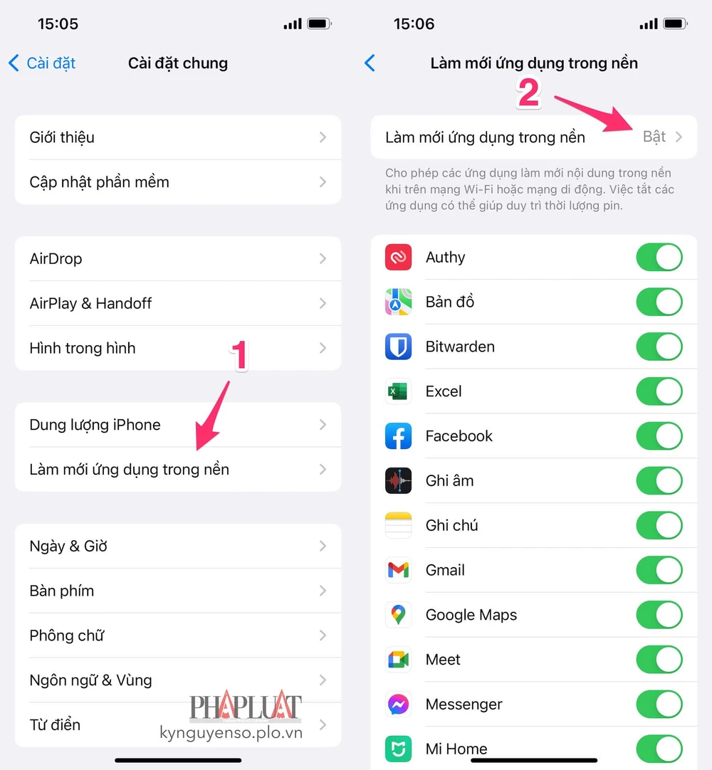 Đầu tiên, bạn hãy truy cập vào phần Settings (cài đặt) - General (cài đặt chung) - Background app refresh (làm mới ứng dụng trong nền) - Off (tắt). Điều này có nghĩa là các ứng dụng như Facebook, tỉ giá, thể thao… sẽ không tự động cập nhật dữ liệu trong nền cho đến khi bạn mở ứng dụng.