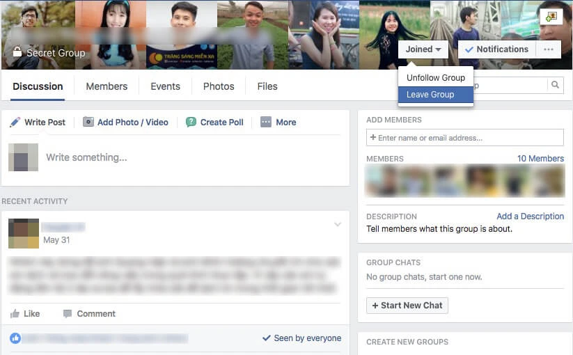 Cuối cùng, nếu muốn thoát khỏi các group không mong muốn trên Facebook, bạn chỉ cần nhấn vào nút Joined > Leave Group, đồng thời cấm các thành viên khác trong group thêm bạn trở lại.