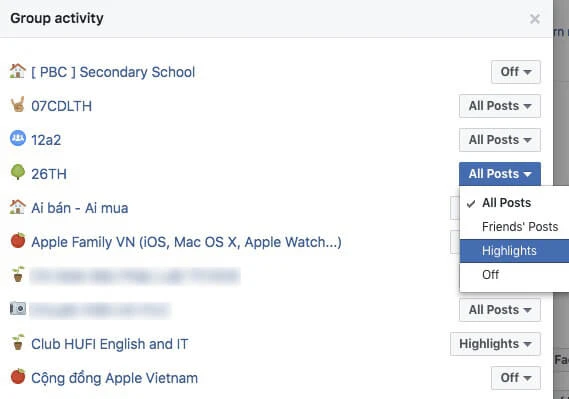 - Bước 3: Tại đây sẽ bao gồm danh sách tất cả group bạn đang tham gia hoặc bị người khác thêm vào. Để tắt thông báo từ một group bất kỳ, người dùng chỉ cần thiết lập là off. Ngược lại, nếu chọn Friends’ Posts, bạn sẽ chỉ nhận được thông báo khi bạn bè đăng bài, Highlights (các bài viết được đề xuất hoặc gợi ý) và All Posts (nhận thông báo tất cả bài viết).