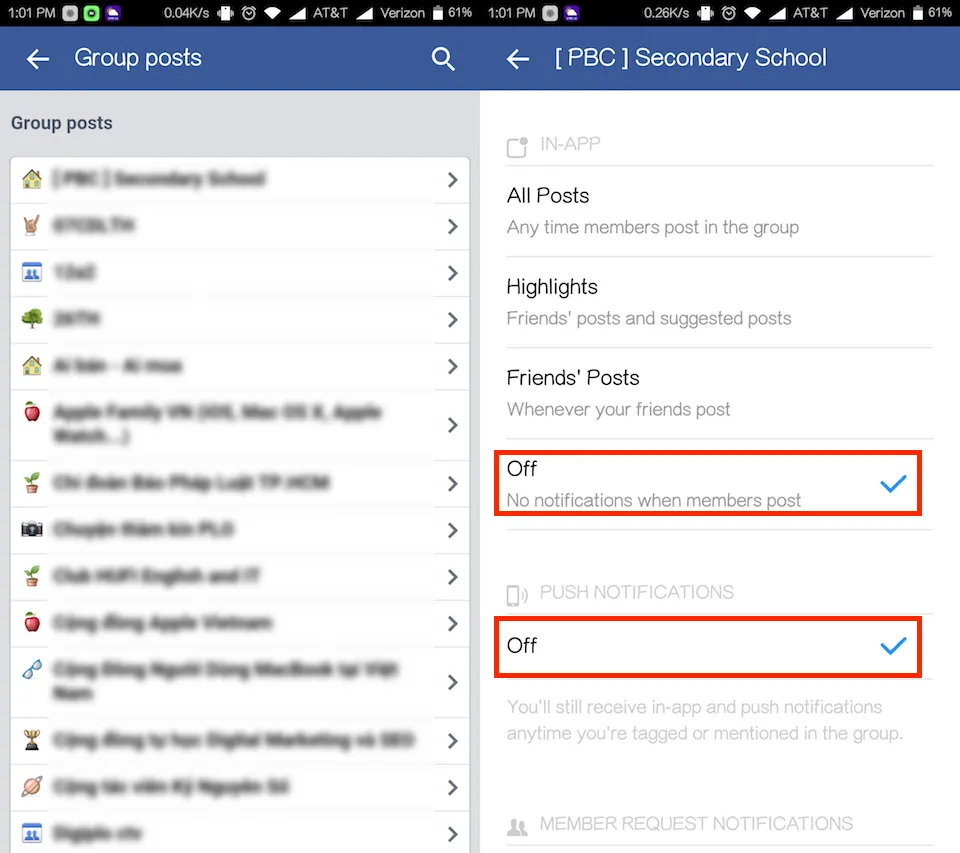 - Bước 3: Tại đây, bạn hãy nhấn vào các nhóm cần tắt thông báo rồi nhấn Off ở hai mục No notifications when members post và Push Notifications.