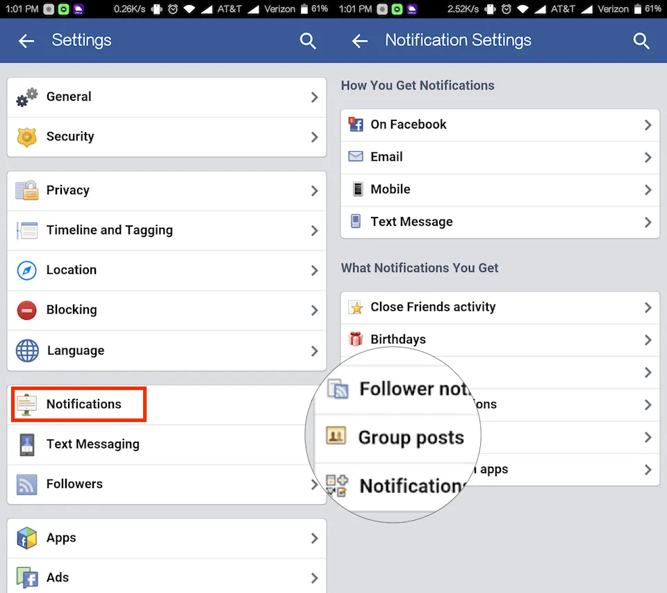 - Bước 2: Chạm vào biểu tượng menu ở góc trên bên phải, tìm đến mục Account Settings > Notifications > Group posts.