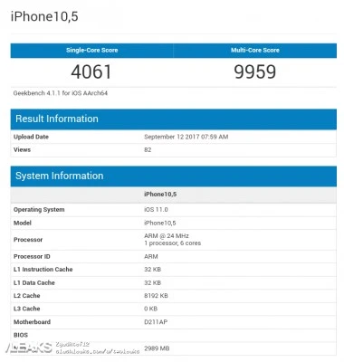 Theo thông tin benchmark trên trang Geekbench, chiếc iPhone X có điểm số đơn nhân là 4061 điểm, còn điểm số đa nhân là 9959 điểm. Con số này vượt xa chiếc Samsung Galaxy S8 cả về đơn nhân và đa nhân. Chiếc điện thoại của Samsung đạt lần lượt 2010/6722 điểm trong bài đánh giá Geekbench 4.0. Galaxy Note 8 sử dụng vi xử lý tương đương S8, do vậy nhiều khả năng iPhone X sẽ một lần nữa bỏ xa Note 8 về mặt hiệu năng.