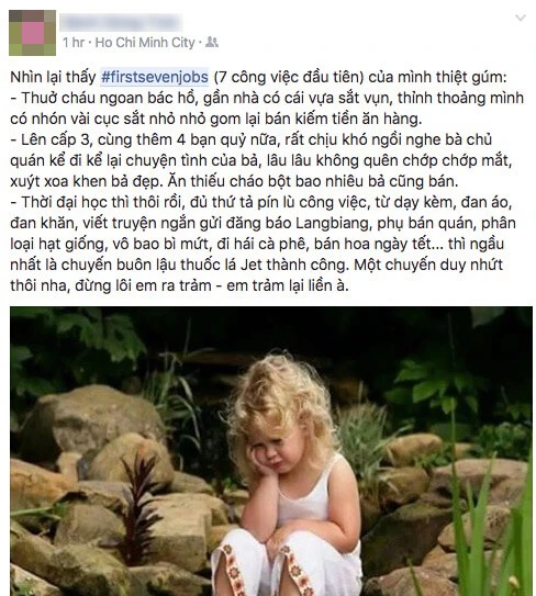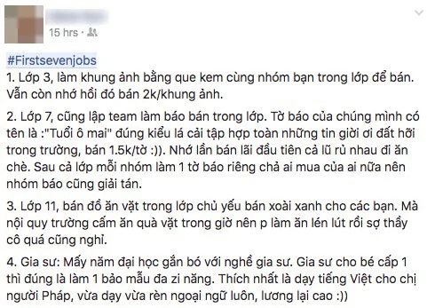 Tại Việt Nam, #Firstsevenjobs cũng đang lan rộng bởi những chia sẻ khá hài hước từ cộng đồng mạng. Dù bạn là ai, làm gì thì tất cả công việc trước đây đã phần nào giúp bạn trưởng thành và chín chắn hơn.