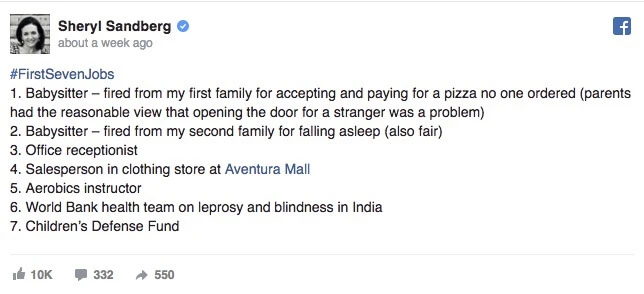 Ngay cả những người nổi tiếng như Sheryl Sandberg (cựu phó chủ tịch Google) cũng bắt đầu bằng công việc giữ trẻ, thậm chí bà còn bị sa thải đến hai lần trước khi giữ nhiều chức vụ quan trọng tiếp theo.