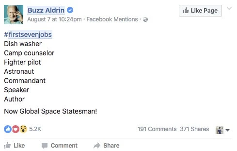 Hay cựu phi hành gia Buzz Aldrin, người thứ hai đặt chân xuống mặt trăng chỉ sau Neil Armstrong, cũng chia sẻ về công việc đầu tiên ông làm là rửa chén. Nếu không có trào lưu này, thiết nghĩ rất khó để họ trải lòng về những ngày tuổi trẻ.