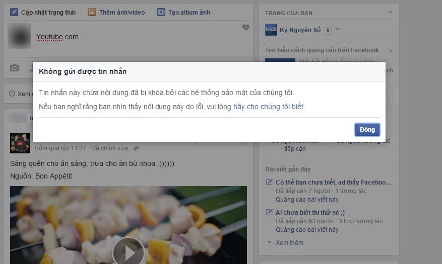 Đây là một hiện tượng lạ, chưa rõ là lỗi hay một “sự cố ngoài ý muốn”, nhưng thử nghiệm của Kỷ Nguyên Số, việc gõ và chia sẻ domain chính “Youtube.com” (không phải gõ cả đường dẫn hoàn chỉ mà chỉ gõ tên miền của Youtube) là điều bất khả thi ở thời điểm hiện tại. Nếu như cố ý thực hiện thao tác đăng status hoặc gửi qua Facebook Messenger, bạn sẽ nhận được thông báo như sau: