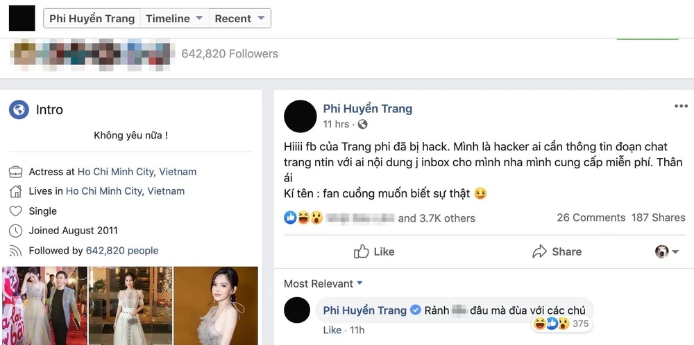 “Hiiii Facebook của Trang phi đã bị hack. Mình là hacker, ai cần thông tin đoạn chat Trang nhắn tin với ai nội dung gì thì inbox cho mình nha, mình cung cấp miễn phí. Thân ái! Kí tên: fan cuồng muốn biết sự thật.” Dòng chia sẻ lạ trên Facebook của Phi Huyền Trang đã nhanh chóng nhận được nhiều bình luận và lượt chia sẻ của người dùng mạng xã hội.
