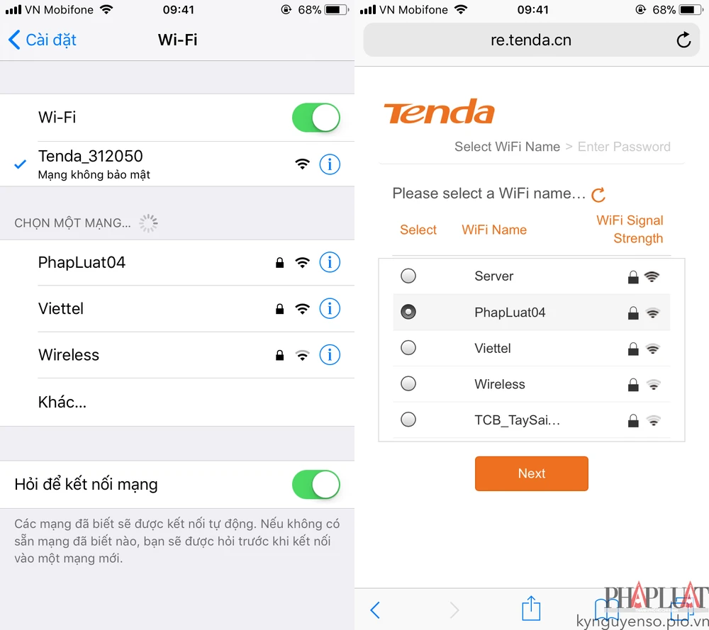 - Bước 2: Khi kết nối thành công, bạn mở trình duyệt và truy cập vào địa chỉ re.tenda.cn và chọn WiFi cần tăng sóng, nhấn Next để chuyển sang bước tiếp theo.