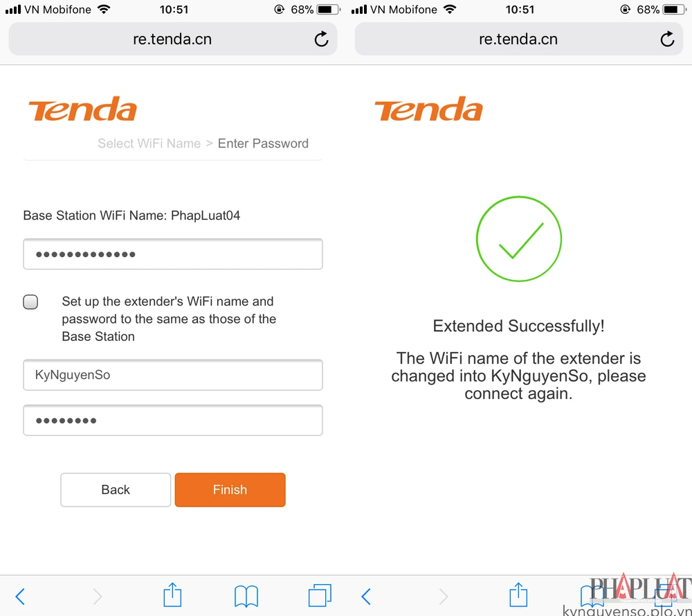 - Bước 3: Tại đây, bạn cần nhập vào mật khẩu WiFi cũ, sau đó bỏ dấu chọn tại mục Set up the extender’s… đặt tên cho điểm truy cập mới cùng mật khẩu tương ứng, nhấn Finish và chờ một lát cho đến khi xuất hiện thông báo Extended Successfully.