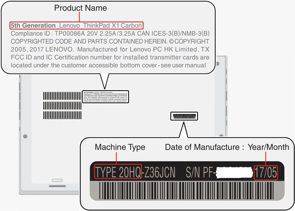 Cụ thể, dòng laptop bị thu hồi là Lenovo ThinkPad X1 Carbon (thế hệ thứ năm) được sản xuất từ tháng 12-2016 đến tháng 10-2017, bao gồm các model 20HQ, 20HR, 20K3, 20K4. Lưu ý, những máy được sản xuất sau ngày 1-11-2017 không bị ảnh hưởng. Bạn đọc có thể tự kiểm tra thông tin ngày sản xuất bằng cách lật lại mặt lưng máy và xem hướng dẫn như ảnh bên dưới.
