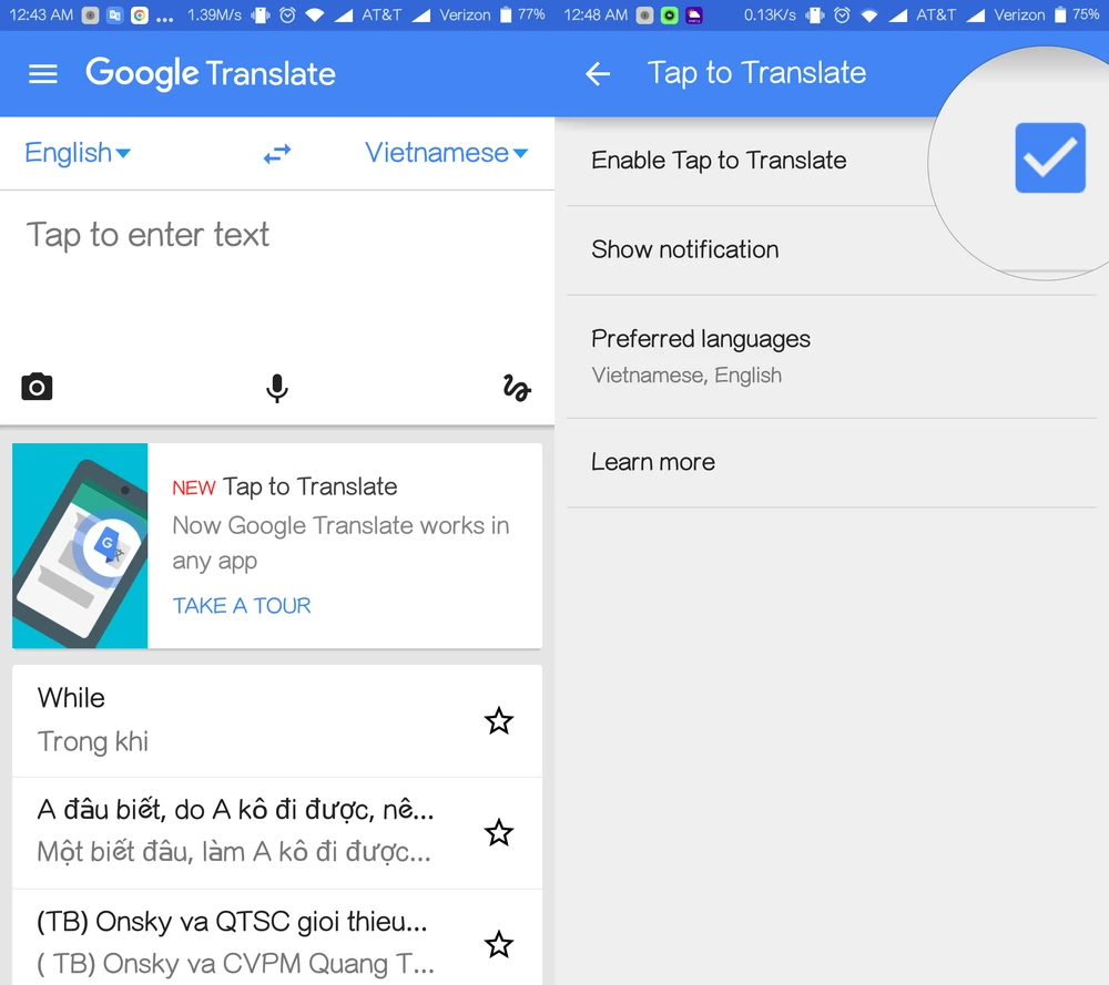 Để khắc phục hạn chế này, Google đã bổ sung tính năng Tap to Translate, cho phép bạn dịch nhanh thông qua pop-up nhỏ ở góc trên bên phải mà không cần chuyển đổi qua lại giữa các ứng dụng. Tính năng này hiện tại đã được cập nhật cho cả hai hệ điều hành Android và iOS.
