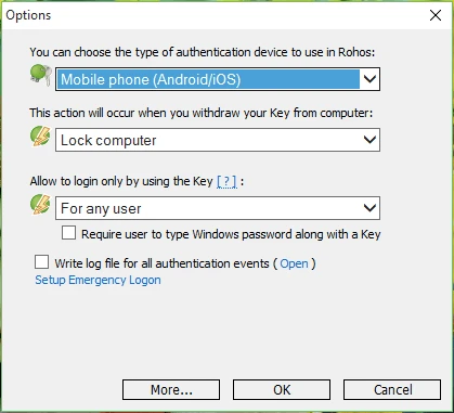 - Bước 2: Tiếp theo, bạn nhấp vào mục Options, lựa chọn thiết bị dùng để mở khóa là Mobile phone (Android/iOS) và thiết lập các thông số bên dưới tương tự như trong hình, sau đó bấm OK để lưu lại.