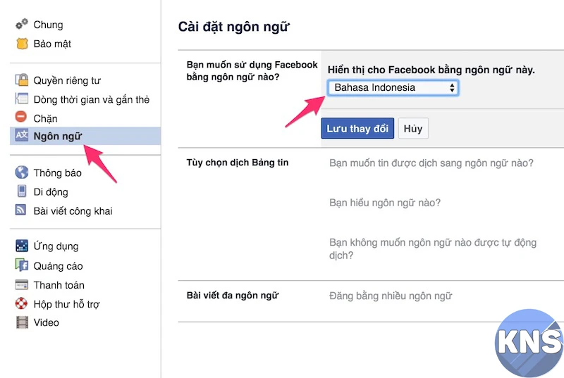 - Bước 2: Trong cửa sổ mới, bạn hãy nhấn vào nút Edit (chỉnh sửa) tại mục What language do you want to use Facebook in? (bạn muốn sử dụng Facebook bằng ngôn ngữ nào?) và chọn Bahasa Indonesia rồi nhấn Save change (lưu thay đổi).